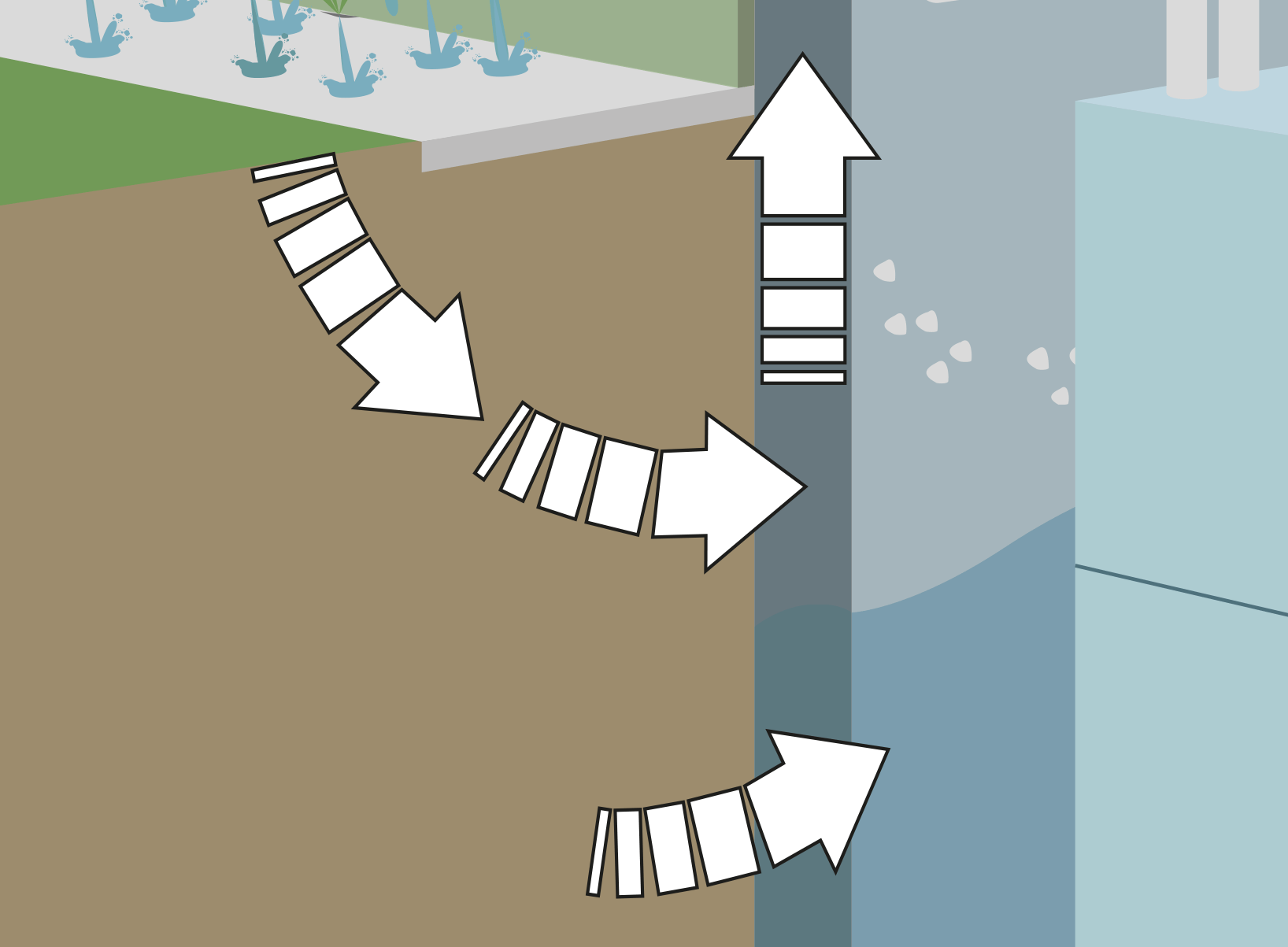 Durch Niederschlag entstehendes Oberflächenwasser kann ungehindert in Fugen zwischen dem Erdreich und der Hausmauer eindringen. Das Mauerwerk wird dadurch unter Erdniveau (Keller) meist stark durchnässt.